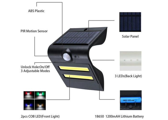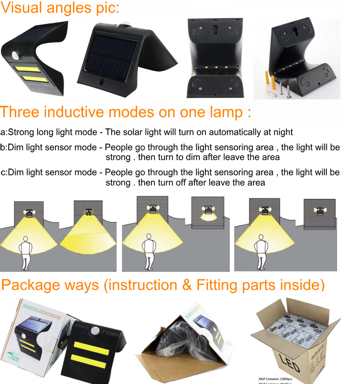 Led solar security light comes with 3 modes,a full-on mode for your front or back door, or deck area; a reduced light mode for your balcony and entryway; and a motion-detected mode for your garage, driveway, and fence
